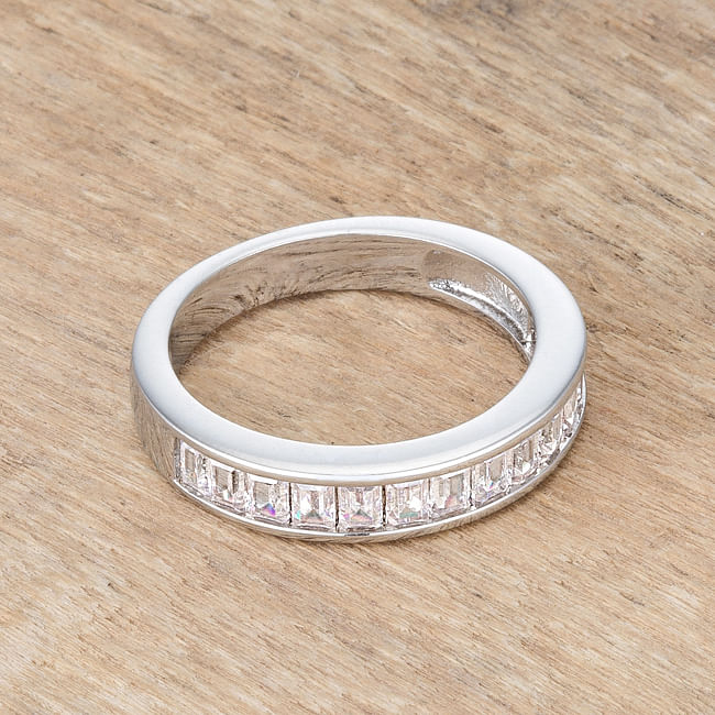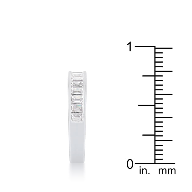 For old world elegance mixed perfectly with sleek modern design there is no better choice than this band. The brilliant shine is achieved with rhodium plating the same process used with white gold. The cubic zirconia is cut in an baguette cut and totals .77Ct and that allows a beautiful geometric placement on the band for stylish upscale effect. This ring belongs on the one you love!