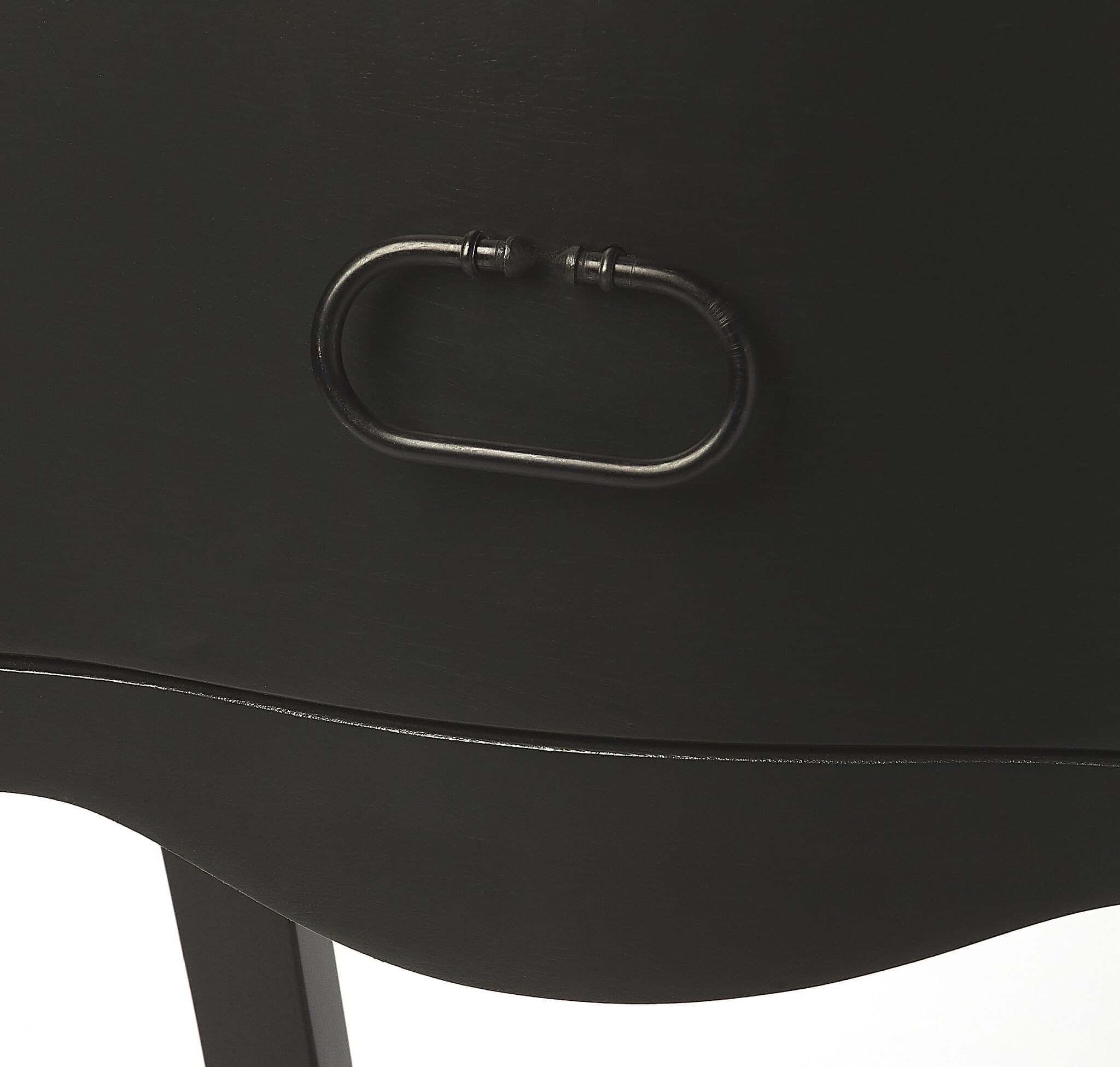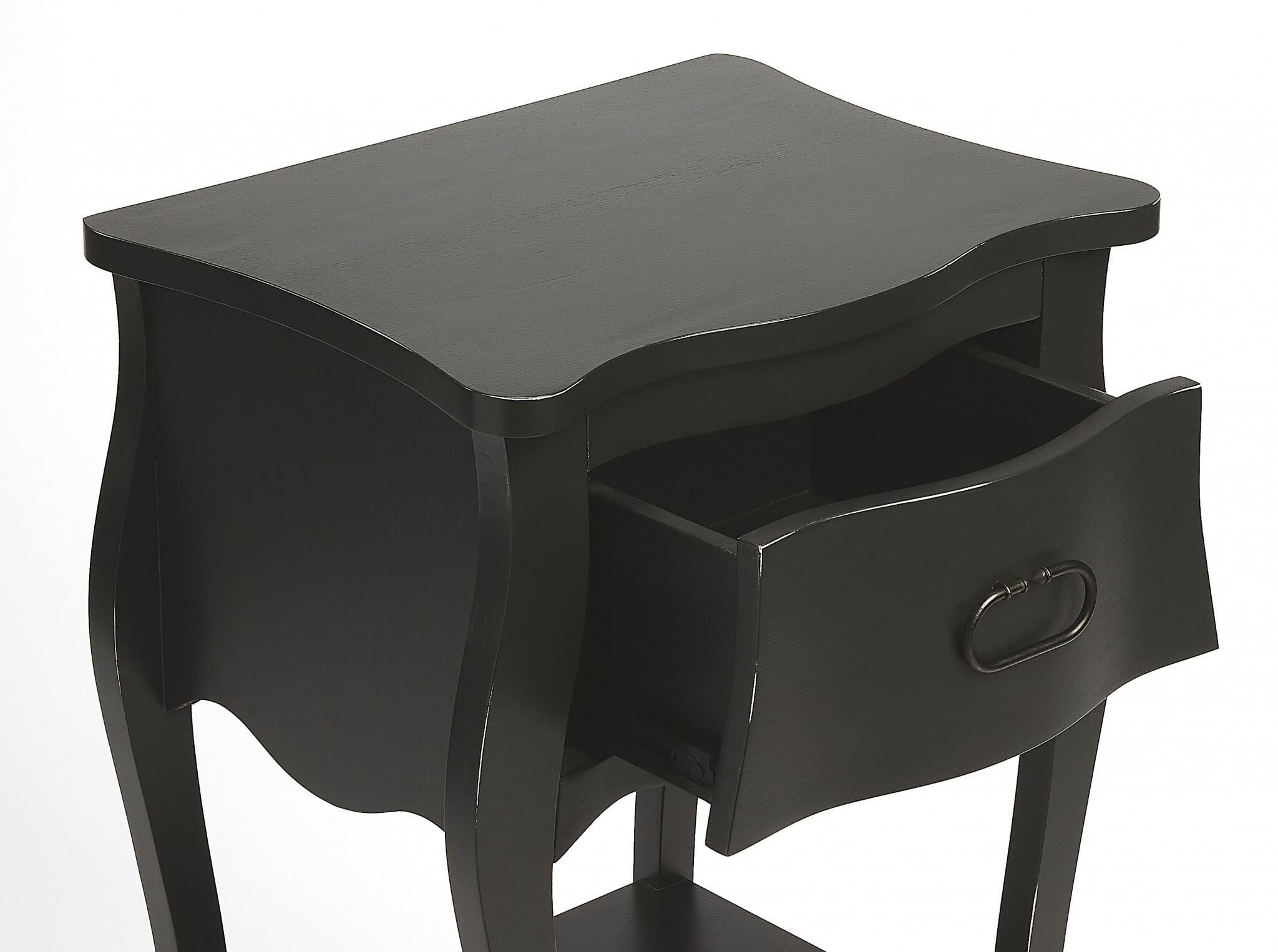 Exquisitely crafted from solid wood, wood products and veneer finish, The Black Single Drawer Night Stand is a classically good looking way to keep your essentials close by and easily accessible. Four strong saber legs adorn a scalloped apron design and include a bottom shelf for additional storage/display. The drawer is affixed with a vintage style iron handle making it easier to access. The night stand is versatile in nature and can also be used in the den, living room, or entrance hallway as an end or accent table. 28″ x 18″ x 14.25″
