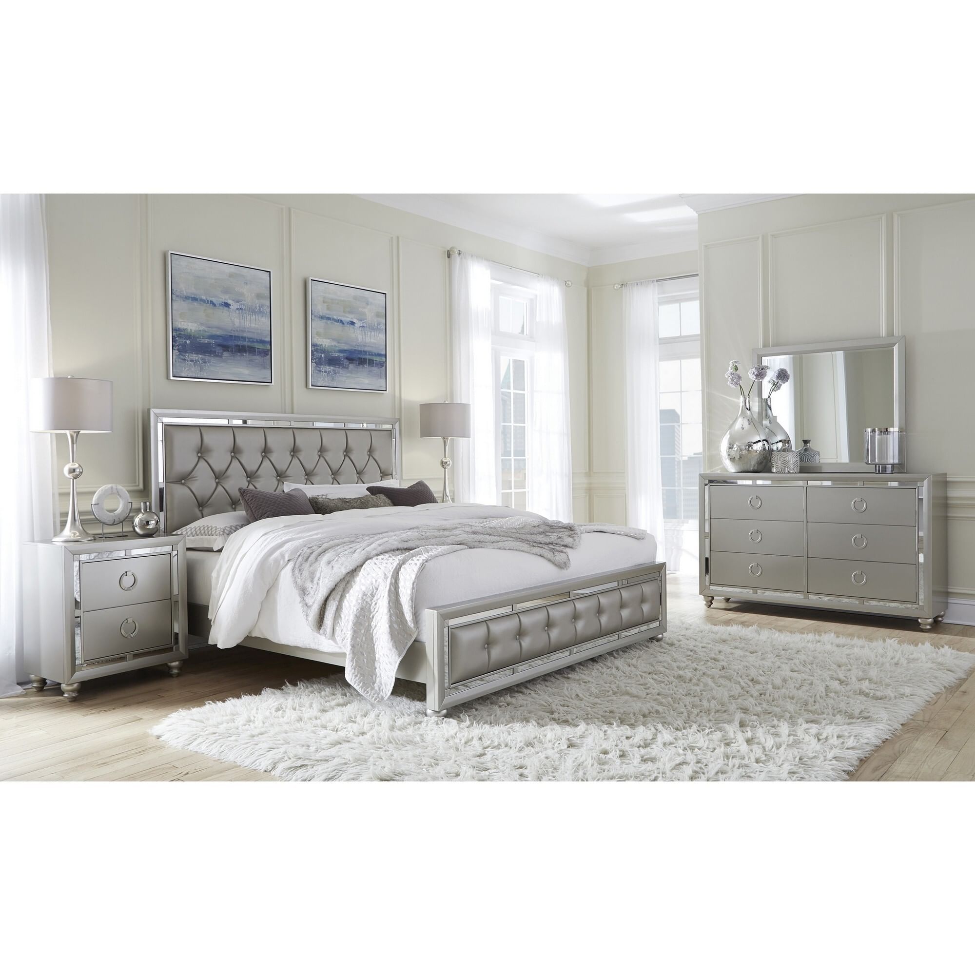 Shown here is the delightful nightstand, sure to create a charming, elegant look for your sleeping area. This contemporary nightstand has sleek styling and pleasing accents and the enchanting silver champagne tone with mirror trim accent make coordinating room decor easy and stress-free. This nightstand is spacious, and has silver-toned knocker style drawer front hardware and bun style feet complement the overall design and contribute to the lovely and sophisticated appearance of this furniture. Quality craftsmanship in every facet of production ensures durability and long-lasting wear. Create the inviting bedroom setting of your dreams by having a nightstand and watch your bedroom area become a haven of comfort and relaxation for your home for years to come.