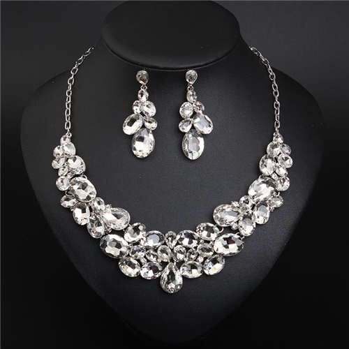 Classic Design Glass Gem Inserted Women Statement Bib Necklace and Earrings Set – White