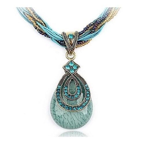 Bohemian Style Rhinestone Decorated Vintage Waterdrop Pendant Mini Beads and Threads Weaving Necklace – Blue